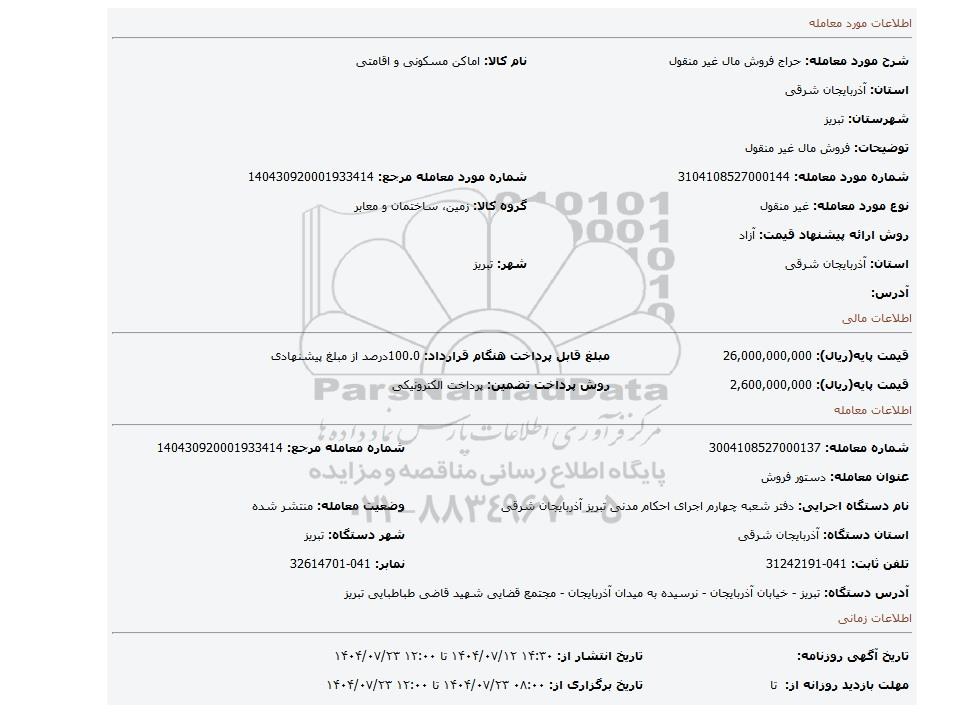 | شرح مورد معامله: حراج فروش مال غیر منقول | نام کالا: اماکن مسکونی و اقامتی | |