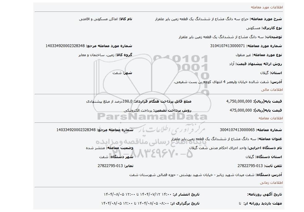 | نوع مورد معامله: غیر منقول | گروه کالا: زمین، ساختمان و معابر | |
