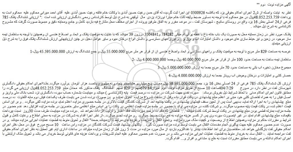 ارزش کل ششدانگ پلاک 785 فرعی از 24 اصلی بخش 16 یزد جمعا 58.595.000.000 ریال معادل پنج میلیاردو هشتصدو پنجاه و نه میلیون و پانصد هزار /تومان .برآورد میگردد.»لذااجرای احکام حقوقی دادگستری شهرستان تفت در نظر دارد در مورخ      404/7/29ساعت 10 صبح از طریق مزایده نوبت  دوم  میزان679.84سهم از 829 سهم   ششدانگ  پلاک مذکور که  معادل مبلغ  48.052.253.759ریال ارزیابی می گردد را مطابق قانون اجرای احکام مدنی  با لحاظ شرایط ذیل بفروش برساند:   -سپرده نقدی جهت شرکت در مزایده ده درصد قیمت  پایه (کارشناسی ) میباشد و میبایست بشماره حساب سپرده دادگستری نزد شعب بانک ملی واریز و اصل فیش را به همراه تقاضای کتبی خود مبنی بر اعلام مبلغ پیشنهادی در پاکت قرار داده وقبل از ساعت شروع مزایده  تحویل نمایند و  در صورت برنده شدن می بایست ظرف یکساعت فیش دوم مابه التفاوت  ده درصد مبلغ  پیشنهادی را به اجرا ارائه نماید بدیهی است پس از تعیین سقف قیمتهای پیشنهادی در پاکت چنانچه احد از شرکت کنندگان قیمت بالاتری در جلسه حضوری مزایده اعلام نماید برنده مزایده تلقی میگردد . و بر این اساس قیمت اعلام شده در پاکت قیمت پایه محسوب میگردد. و شرکت کننده در مزایده می تواند با حضور در جلسه مزایده قیمت اعلامی در پاکت را بر اساس مبلغ اعلامی سایر حاضرین در جلسه مزایده افزایش دهد عدم حضور در جلسه مزایده بمنزله قطعی بودن مبلغ پیشنهادی در پاکت توسط شرکت کننده میباشد . .  تقاضایی که فاقد ده درصد سپرده باشد فاقد اعتبار و ترتیب اثر داده نخواهد شد .-برنده مزایده میبایست ظرف مدت 30روز  نسبت بپرداخت باقیمانده مبلغ پیشنهادی اقدام نماید در غیر اینصورت سپرده وی پس از کسر هزینه مزایده به نفع دولت ضبط  میگردد . و مزایده تجدید میگردد.-از نظر اجرا اقدام به شرکت در مزایده به معنی اطلاع و رعایت کامل و قبول شرایط و مقررات حاکم بر مزایده وهمچنین اطلاع از وضعیت و کیفیت ملک مورد مزایده  و نحوه انتقال و تشریفات و هزینه های مرتبط با آن میباشد.ضمنا" انتقال و تحویل منوط به قطعیت عملیات اجرایی مزایده میباشد .و در صورت عدم حضور محکوم علیه جهت پیگیری انجام مقدمات انتقال می بایست توسط برنده مزایده صورت گیرد . -پاکتهای پیشنهاد قیمت شرکت کنندگان در مزایده راس ساعت   10 صبح مورخ  فوق در محل دفتر اجرای احکام حقوقی تفت بازگشایی خواهد شد.-متقاضیان برای اخذ اطلاعات بیشتر یا عنداللزوم بازدید از مال مورد مزایده در مدت 5 روز قبل از زمان مزایده میتوانند در ساعات اداری ایام غیر تعطیل به دفتر اجرای احکام حقوقی تفت مراجعه نمایند .- انتقال سند به خریدار منوط به قطعیت عملیات اجرایی مزایده می باشد و در صورت عدم حضور محکوم علیه انجام تشریفات و پرداخت هزینه های قانونی توسط خریدار می باشد و تحویل ملک ارتباطی با اجرای احکام نداشته و می بایست مطابق مقررات نسبت به خلع ید مشاعی و افراز و... اقدام گردد.