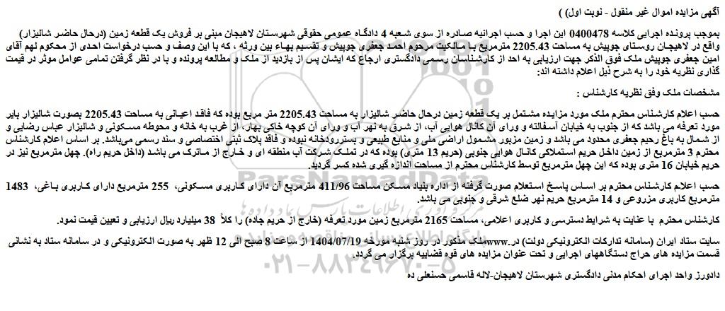 بموجب پرونده اجرایی کلاسه 0400478 این اجرا و حسب اجرائیه صادره از سوی شعبه 4 دادگاه عمومی حقوقی شهرستان لاهیجان مبنی بر فروش یک قطعه زمین (درحال حاضر شالیزار) واقع در لاهیجان روستای جوپیش به مساحت 2205.43 مترمربع با مالکیت مرحوم احمد جعفری جوپیش و تقسیم بهاء بین ورثه ، که با این وصف و حسب درخواست احدی از محکوم لهم آقای امین جعفری جوپیش ملک فوق الذکر جهت ارزیابی به احد از کارشناسان رسمی دادگستری ارجاع که ایشان پس از بازدید از ملک و مطالعه پرونده و با در نظر گرفتن تمامی عوامل موثر در قیمت گذاری نظریه خود را به شرح ذیل اعلام داشته اند: