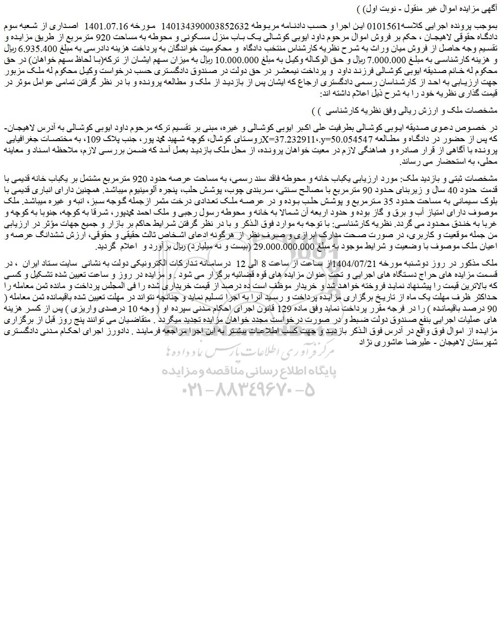 بموجب پرونده اجرایی کلاسه0101561 این اجرا و حسب دادنامه مربوطه 140134390003852632 مورخه 1401.07.16 اصداری از شعبه سوم دادگاه حقوقی لاهیجان ، حکم بر فروش اموال مرحوم داود ایوبی کوشالی یک باب منزل مسکونی و محوطه به مساحت 920 مترمربع از طریق مزایده و تقسیم وجه حاصل از فروش میان وراث به شرح نظریه کارشناس منتخب دادگاه و محکومیت خواندگان به پرداخت هزینه دادرسی به مبلغ 6.935.400 ریال و هزینه کارشناسی به مبلغ 7.000.000 ریال و حق الوکاله وکیل به مبلغ 10.000.000 ریال به میزان سهم ایشان از ترکه(با لحاظ سهم خواهان) در حق محکوم له خانم صدیقه ایوبی کوشالی فرزند داود و پرداخت نیمعشر در حق دولت در صندوق دادگستری حسب درخواست وکیل محکوم له ملک مزبور جهت ارزیابی به احد از کارشناسان رسمی دادگستری ارجاع که ایشان پس از بازدید از ملک و مطالعه پرونده و با در نظر گرفتن تمامی عوامل موثر در قیمت گذاری نظریه خود را به شرح ذیل اعلام داشته اند: