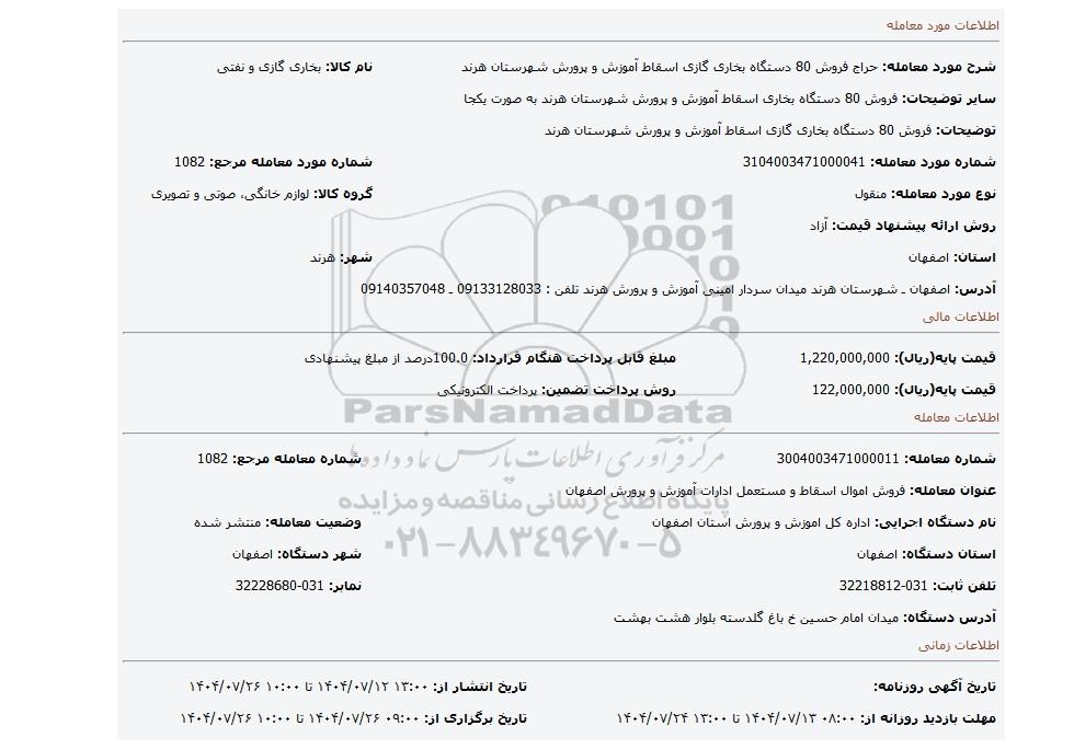 | سایر توضیحات: فروش 80 دستگاه بخاری اسقاط آموزش و پرورش شهرستان هرند به صورت یکجا | ||