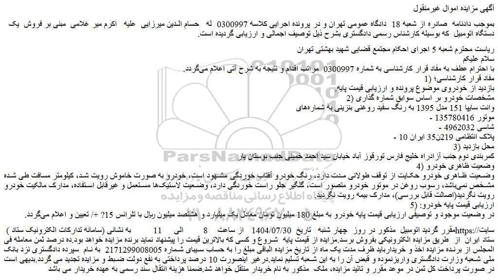 بموجب دادنامه صادره از شعبه 18 دادگاه عمومی تهران و در پرونده اجرایی کلاسه 0300997 له حسام الدین میرزایی علیه اکرم میر غلامی مبنی بر فروش یک دستگاه اتومبیل که بوسیله کارشناس رسمی دادگستری بشرح ذیل توصیف اجمالی و ارزیابی گردیده است.