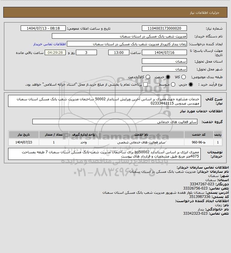 شرح کلی نیاز: خدمات مشاوره جهت ممیزی بر اساس آخرین ویرایش استاندار 50002 ساختمان مدیریت شعب بانک مسکن استان سمنان مهندس عبدوس 02333441115
