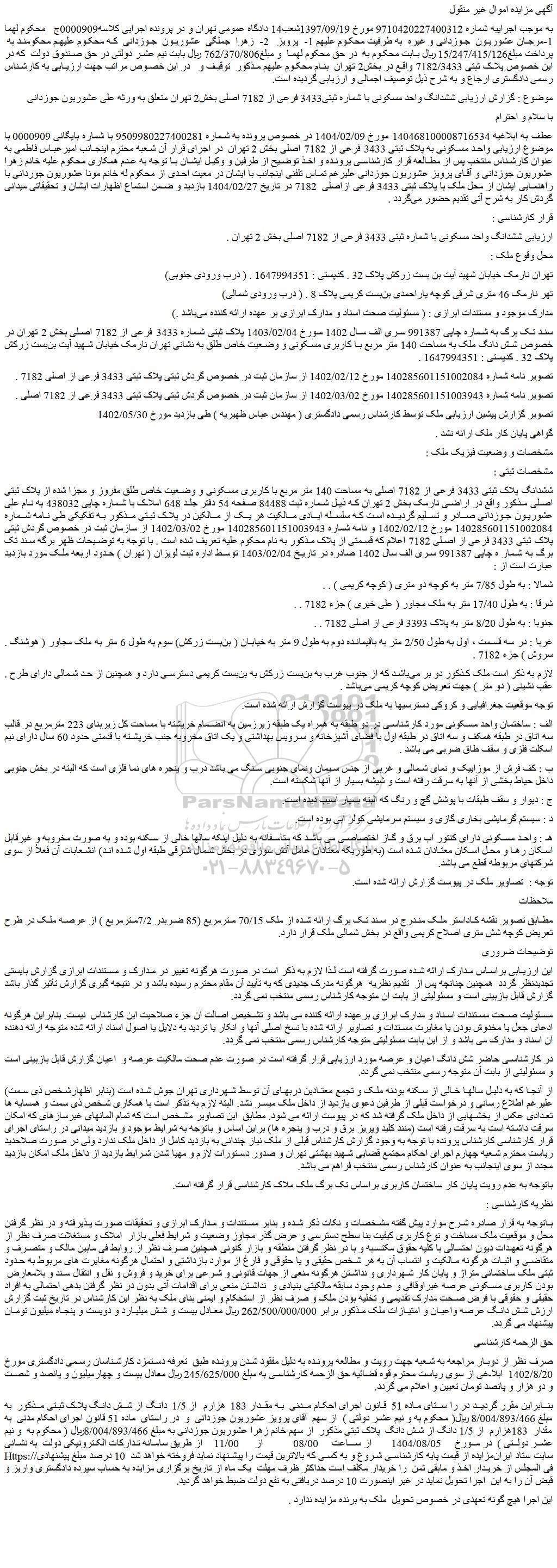 به موجب اجراییه شماره 9710420227400312 مورخ 1397/09/19شعب14 دادگاه عمومی تهران و در پرونده اجرایی کلاسه0000909ج   محکوم لهما 1-مرجان عشوریون  جوزدانی و غیره  به طرفیت محکوم علیهم 1- پرویز   2-  زهرا  جملگی  عشوریون  جوزدانی  که محکوم علیهم محکومند به  پرداخت مبلغ15/247/415/126 ریال بابت محکوم به  در حق محکوم لهما  و مبلغ762/370/806 ریال بابت نیم عشر دولتی در حق صندوق دولت  که در این خصوص پلاک ثبتی 7182/3433 واقع در بخش2 تهران  بنام محکوم علیهم مذکور  توقیف و   در این خصوص مراتب جهت ارزیابی به کارشناس رسمی دادگستری ارجاع و به شرح ذیل توصیف اجمالی و ارزیابی گردیده است.