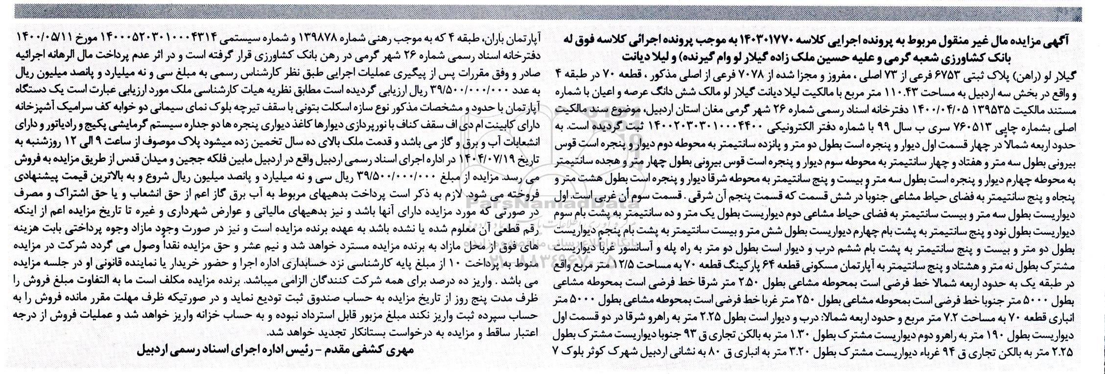 آگهی مزایده مال غیر منقول مربوط به پرونده اجرایی کلاسه 140301770