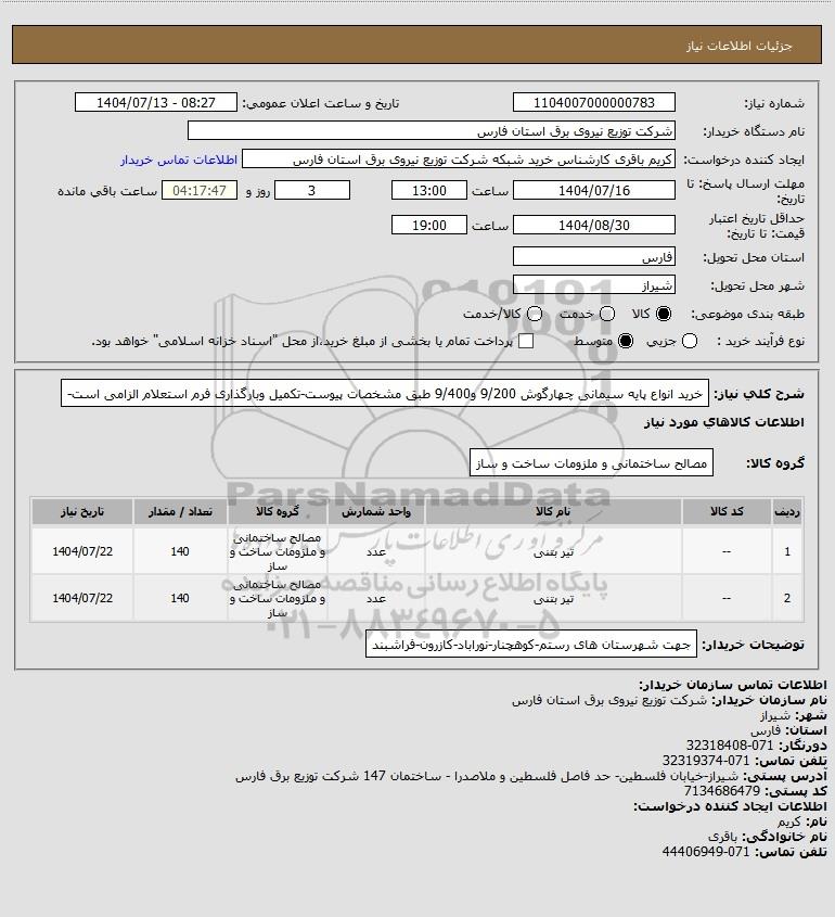 شرح کلی نیاز: خرید انواع پایه سیمانی چهارگوش 9/200 و9/400 طبق مشخصات پیوست-تکمیل وبارگذاری فرم استعلام الزامی است-