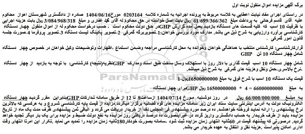 در راستای اجرای مفاد نیابت اعطایی به کلاسه مربوط به پرونده اجرائیه به شماره کلاسه  0203164  مورخ1404/06/16  صادره از دادگستری شهرستان اهواز  محکوم علیه  آقای  قاسم فرحانی  به پرداخت مبلغ  61/699/366/362  ریال بابت اصل خواسته در حق محکومٌ له آقای محمد غفاری و مبلغ  3/084/968/318 ریال بابت هزینه اجرایی در حق دولت محکوم است  ، حسب درخواست محکوم له از اموال منقول  چهار دستگاه ghp با ظرفیت 10 اسب  که  کلیه قسمت های دستگاه بازدید بعمل آمده گزارش کارشناسی برآورد وارزیابی به شرح ذیل می باشد. مدارک مورد بررسی خواهان:1-تصویربرگه گمرکی  2-تصویر پکینگ لیست دستگاه 3-تصویر پروفرما 4-صورت جلسه قانون امور گمرکی  -
