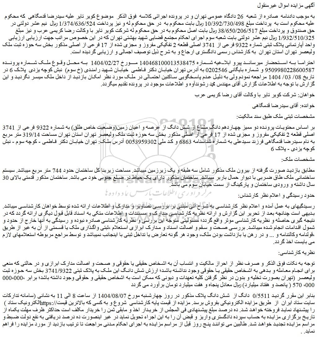 به موجب دادنامه  صادره از شعبه  26 دادگاه عمومی تهران و در پرونده اجرائی کلاسه  فوق الذکر  موضوع کویر تایر علیه سیدرضا قدمگاهی  که محکوم علیه محکوم است به  پرداخت مبلغ 10/392/730/498 ریال بابت محکوم به  در حق محکوم له و نیز پرداخت 1/374/636/524 ریال  نیم عشر دولتی در حق صندوق و پرداخت مبلغ 38/650/206/517 ریال بابت اصل محکوم به در حق محکوم له شرکت کویر تایر با وکالت رضا کریمی عرب و نیز مبلغ 1/932/510/325 ریال نیم عشر دولتی بابت شعبه سوم اجرای احکام مجتمع قضایی شهید بهشتی تهران که در این خصوص مراتب جهت ارزیابی ارزیابی واحد آپارتمانی پلاک ثبتی شماره 9322 فرعی از 3741 اصلی قطعه 2 تفکیکی مفروز و مجزی شده از 17 فرعی از اصلی مذکور بخش سه حوزه ثبت ملک ولیعصر تهران استان تهران  به کارشناس رسمی دادگستری ارجاع و به شرح ذیل توصیف اجمالی و ارزیابی گردیده است.