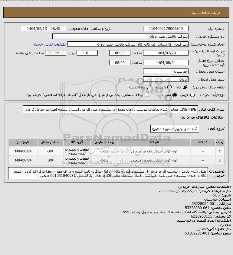 شرح کلی نیاز: LINE PIPE