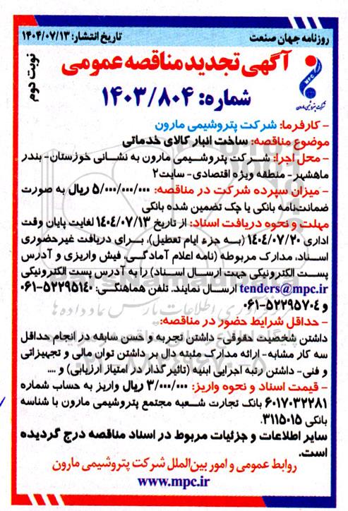 آگهی تجدید مناقصه عمومی شماره 1403/804 - نوبت دوم؟