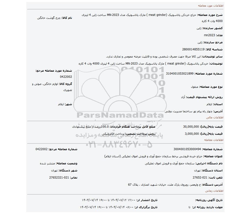 مزایده عمومی مزایده خردکن پاناسونیک (meat grinder ) مارک پاناسونیک مدل MN-2023 ساخت ژاپن 4 لیتری 4000 وات 4 کاره برگزار میگردد. از کلیه افراد متخصص و شرکتهای واجد شرایط دعوت به عمل میآید تا در این مزایده با کد خبرگزاری پارس نماد : 9646050 شرکت نمایند تاریخ شروع مزایده : 1404/07/12 مهلت شرکت در مزایده: تا پایان روز 1404/07/14 مکان برگزاری اموال واگذاری استانهای ایلام و دستهبندیهای مربوط به این حراجی متفرقه میباشد.