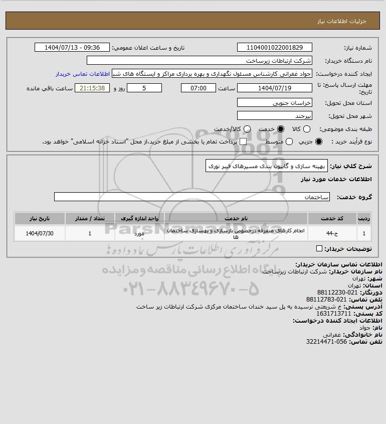 شرح کلی نیاز: بهینه سازی و گابیون بندی مسیرهای فیبر نوری