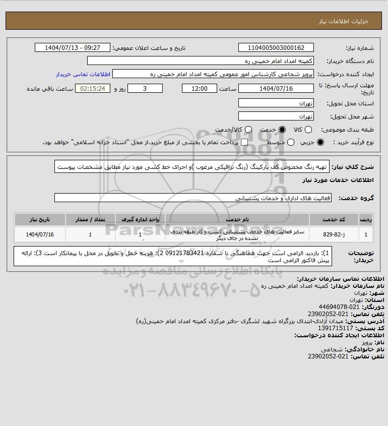 شرح کلی نیاز: تهیه رنگ مخصوص کف پارکینگ (رنگ ترافیکی مرغوب )و اجرای خط کشی مورد نیاز مطابق مشخصات پیوست