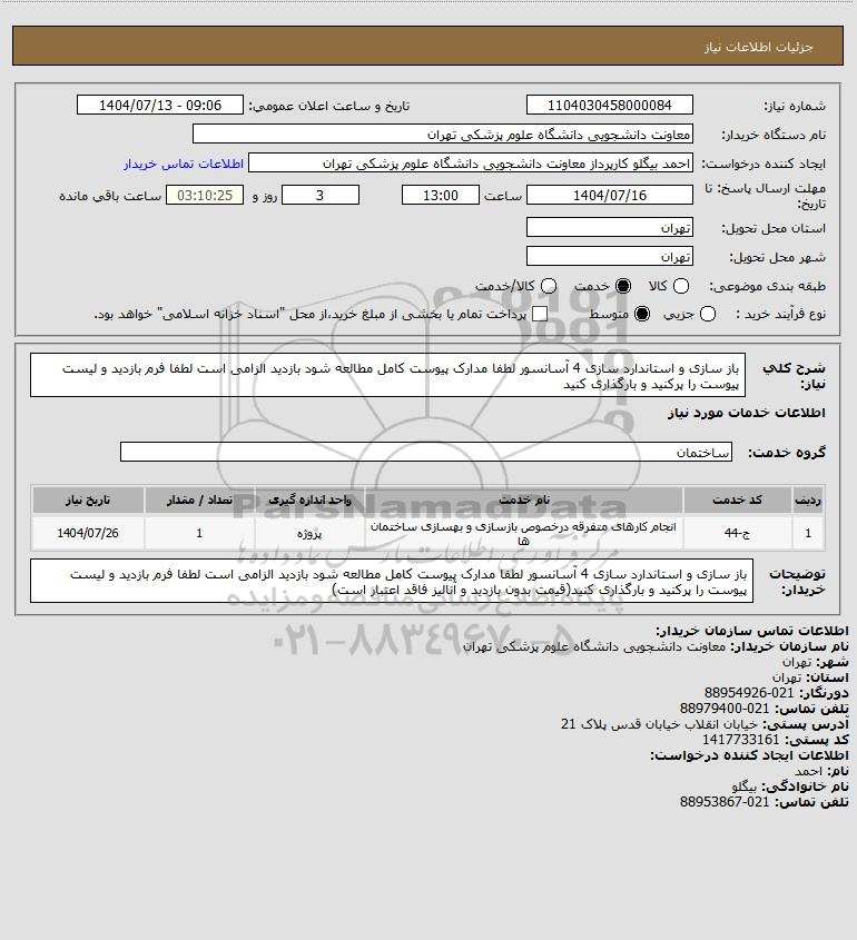 شرح کلی نیاز: باز سازی و استاندارد سازی 4 آسانسور لطفا مدارک پیوست کامل مطالعه شود بازدید الزامی است لطفا فرم بازدید و لیست پیوست را پرکنید و بارگذاری کنید