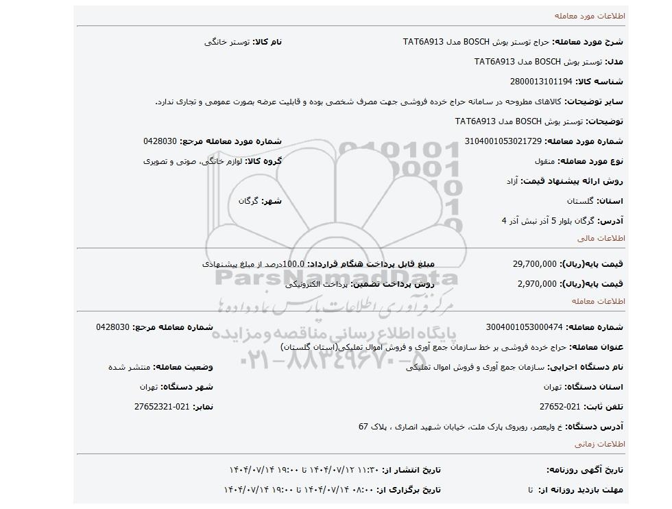 | شماره مورد معامله: 3104001053021729 | شماره مورد معامله مرجع: 0428030 | |