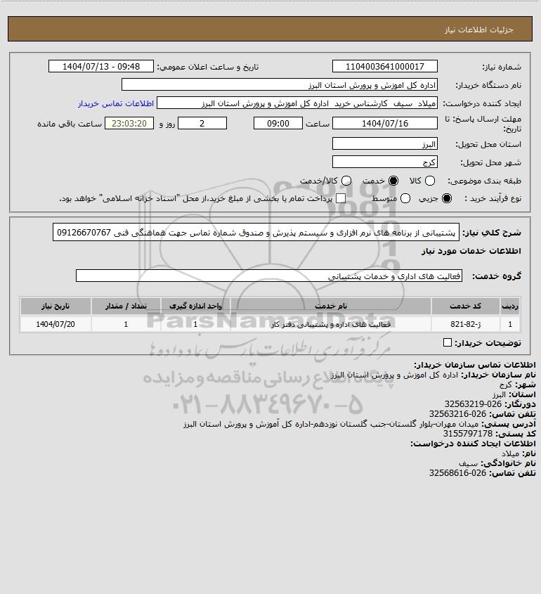 شرح کلی نیاز: پشتیبانی از برنامه های نرم افزاری و سیستم پذیرش و صندوق شماره تماس جهت هماهنگی فنی 09126670767