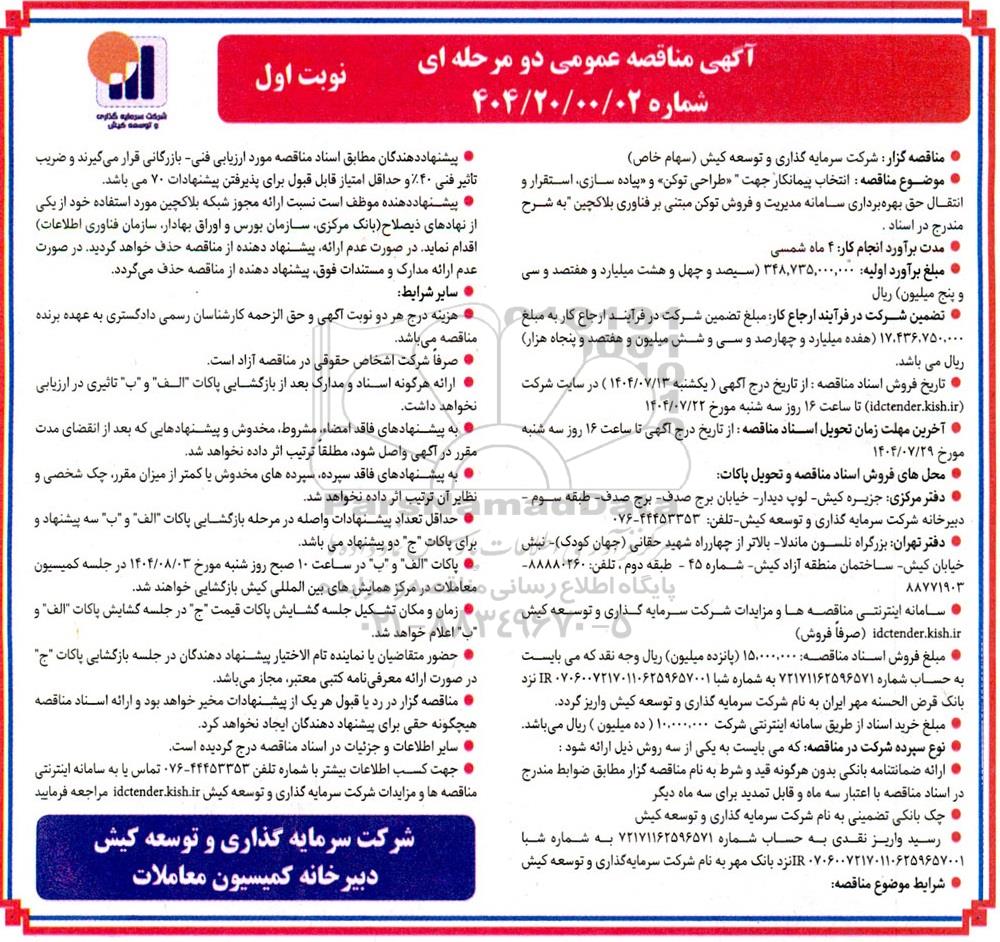 موضوع مناقصه : انتخاب پیمانکار جهت طراحی توکن و پیاده سازی، استقرار و انتقال حق بهره برداری سامانه مدیریت و فروش توکن مبتنی بر فناوری بلاکچین به شرح مندرج در اسناد .