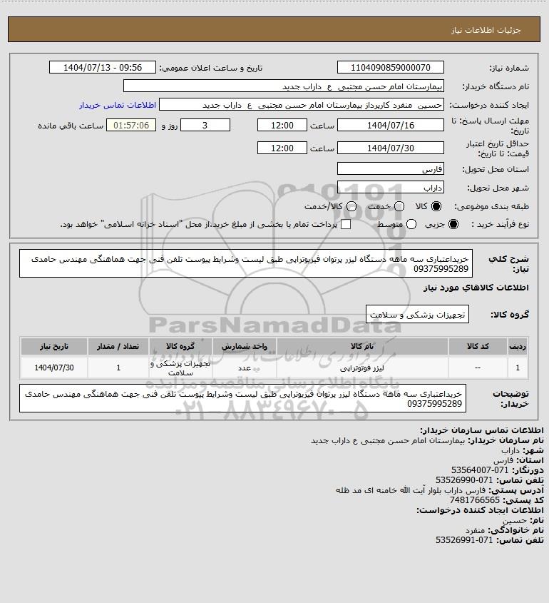 استعلام خریداعتباری سه ماهه دستگاه لیزر پرتوان فیزیوتراپی طبق لیست وشرایط پیوست تلفن فنی جهت هماهنگی مهندس حامدی 09375995289, استعلام خریداعتباری سه ماهه دستگاه لیزر پرتوان فیزیوتراپی طبق لیست وشرایط پیوست تلفن فنی جهت هماهنگی مهندس حامدی 09375995289