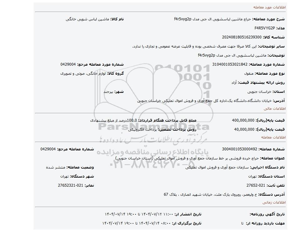 مزایده عمومی مزایده ماشین لباسشویی ال جی مدل f4r5vyg2p برگزار میگردد. از کلیه افراد متخصص و شرکتهای واجد شرایط دعوت به عمل میآید تا در این مزایده با کد خبرگزاری پارس نماد : 9646709 شرکت نمایند تاریخ شروع مزایده : 1404/07/12 مهلت شرکت در مزایده: تا پایان روز 1404/07/14 مکان برگزاری اموال واگذاری استانهای خراسان جنوبی و دستهبندیهای مربوط به این حراجی متفرقه میباشد.