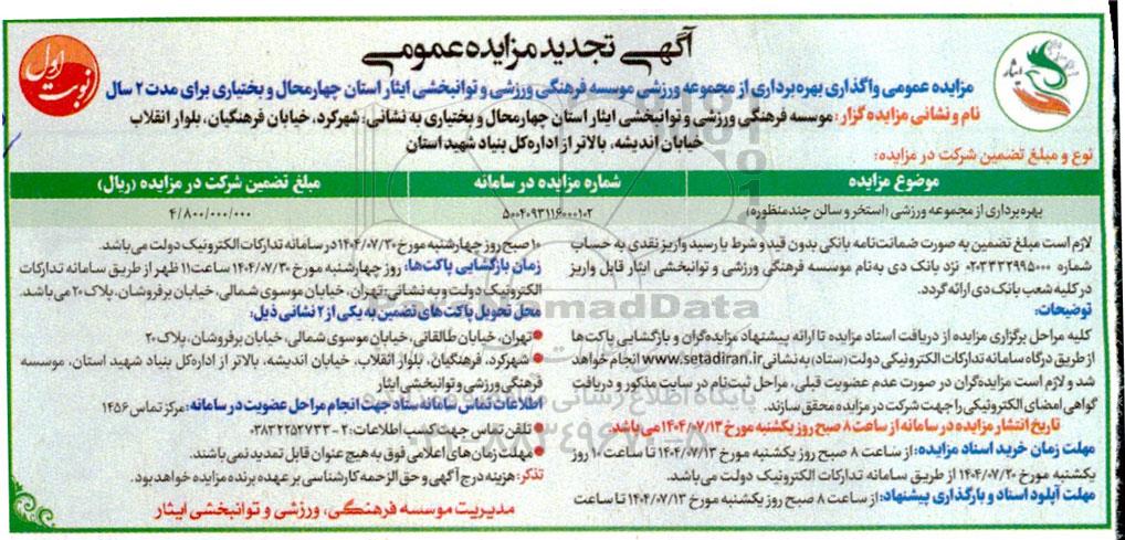 مزایده عمومی واگذاری بهره برداری از مجموعه ورزشی موسسه فرهنگی ورزشی و توانبخشی ایثار استان چهار محال و بختیاری برای مدت 2 سال