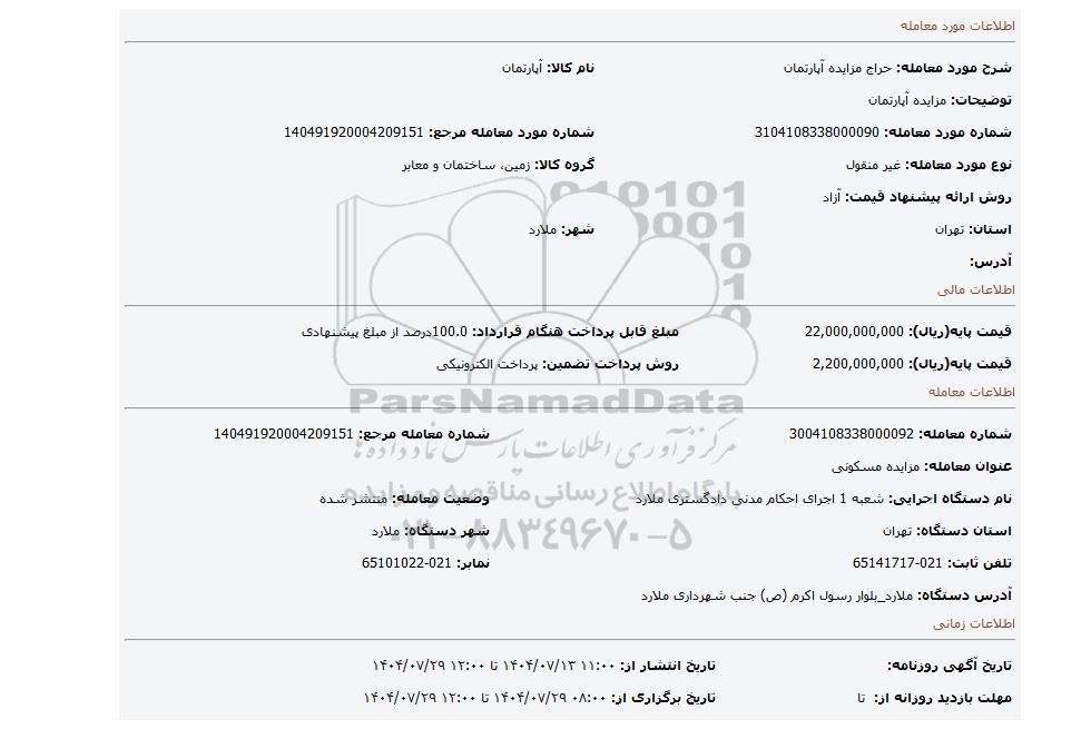 | نام دستگاه اجرایی: شعبه 1 اجرای احکام مدنی دادگستری ملارد | وضعیت معامله: منتشر شده | |