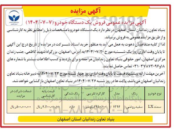 بنیاد تعاون زندانیان استان اصفهان در نظر دارد یکدستگاه خودرو با مشخصات ذیل را مطابق نظریه کارشناسی و از طریق مزایده عمومی به فروش برساند.
