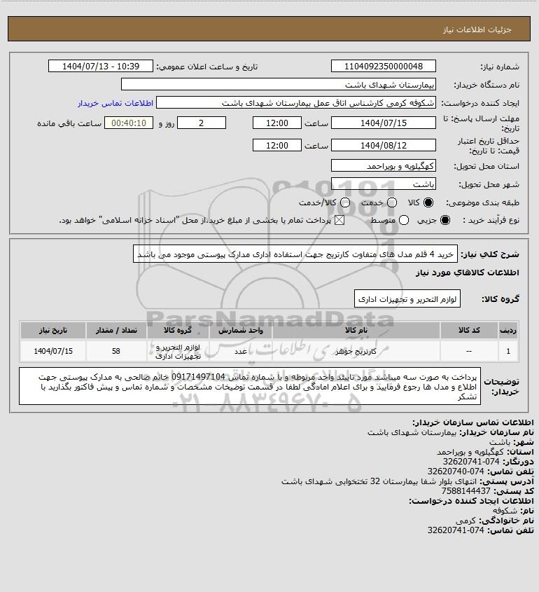 شرح کلی نیاز: خرید 4 قلم مدل های متفاوت کارتریج جهت استفاده اداری مدارک پیوستی موجود می باشد
