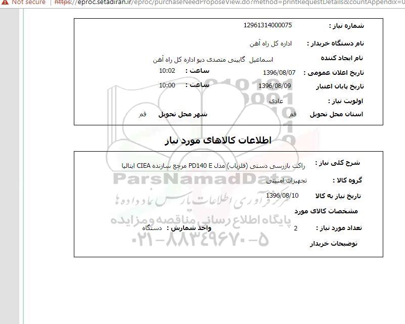 استعلام بها و موضوع استعلام استعلام, استعلام راکت بازرسی دستی به اطلاع کلیه شرکتها و افراد متخصص واجد شرایط میرساند، آگهی گذار در نظر دارد از طریق استعلام بها، نسبت به انتخاب و دریافت پیشنهادات اقدام نماید. این استعلام با کد آگهی ثبت شده در سامانه خبرگزاری پارس نماد : 964715 منتشر شده است. مشخصات استعلام : تاریخ شروع استعلام: 1396/08/07 آخرین مهلت ارسال پیشنهاد قیمت : 1396/08/09 و محل اجرای پروژه : استان قم میباشد. استعلام قیمت مورد درخواست : استعلام, استعلام راکت بازرسی دستی با دستهبندیهای تخصصی و گروه های مرتبط : انواع دستگاه های آشکارساز فلز و لوله یاب, سیستم های حفاظتی-دوربین مدار بسته،دزدگیر،آیفون تصویری و آنتن مرکزی, تجهیزات لیزری, استعلام اطلاع رسانی میگردد. شرایط شرکت در استعلام آنلاین : ابتدا ثبت نام در سامانه استعلام پارس نماد و تکمیل مدارک موردنیاز و بارگذاری در سامانه رعایت تمامی ضوابط و الزامات مندرج در اسناد استعلام است.