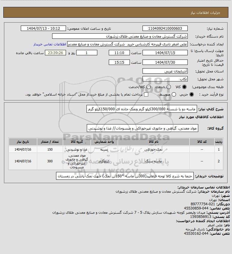 شرح کلی نیاز: ماسه دو با شسته 300/000کیلو گرم ونمک جاده ای 150/000کیلو گرم
