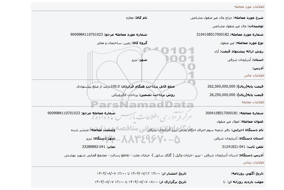 نام دستگاه اجرایی: دفتر شعبه سوم اجرای احکام مدنی تبریز آذربایجان شرقیوضعیت معامله: منتشر شده