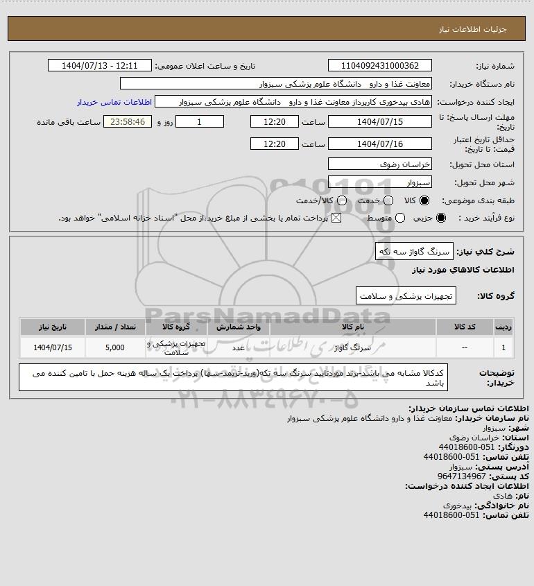 | 1 | -- | سرنگ گاواژ | عدد | تجهیزات پزشکی و سلامت | 5,000 | 1404/07/15 |