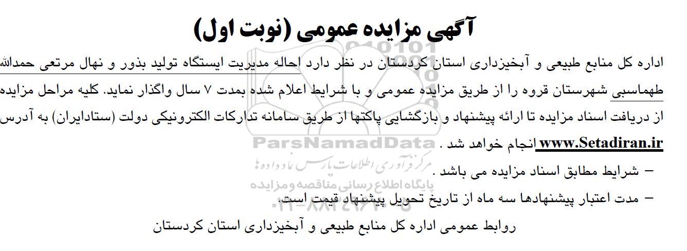اداره کل منابع طبیعی و آبخیزداری استان کردستان در نظر دارد احاله مدیریت ایستگاه تولید بذور و نهال مرتعی حمد الله طهماسبی شهرستان قروه را از طریق مزایده عمومی و با شرایط اعلام شده بمدت 7 سال واگذار نماید. کلیه مراحل مزایده از دریافت اسناد مزایده تا ارائه پیشنهاد و بازگشایی پاکتها از طریق سامانه تداركات الكترونيكي دولت (ستاد ایران) به آدرس ستاد ایران انجام خواهد شد