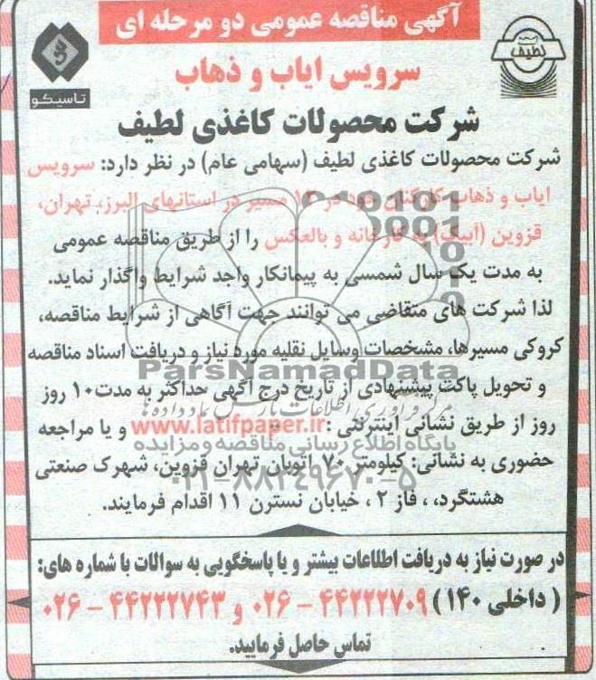 شرکت محصولات کاغذی لطیف (سهامی عام) در نظر دارد: سرویس ایاب و ذهاب کارکنان خود در 12 مسیر در استان های البرز، تهران، قزوین (آبیک) به کارخانه و بالعکس را از طریق مناقصه عمومی به مدت یک سال شمسی به پیمانکار واجد شرایط واگذار نماید.