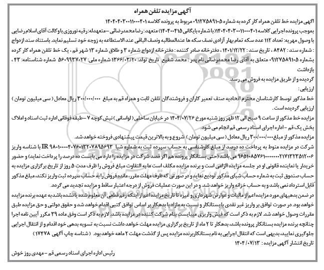 بموجب پرونده اجرایی کلاسه 140404030011000401 با شماره بایگانی (140400415) متعهد رضا محمد رضائی متعهدله رقیه نوروزی با وکالت آقای اسلام رضایی با وصول مهریه تعداد 112 عدد سکه تمام بهار آزادی نصف سکه ها عند المطالبة ونصف الباقي عند الاستطاعه به زوجه خود تسلیم نماید. باستناد سند ازدواج شماره سند : 8482 ، تاریخ سند : 1401.12.22 ، دفترخانه صادر کننده : دفترخانه ازدواج شماره 3 و طلاق شماره 13 شهر قم یک خط تلفن همراه کار کرده بشماره 09127589105 متعلق به آقای رضا محمدرضائی نام پدر : محمد شفیع تاریخ تولد: 1366.3.20 شماره ملی: 5609937027 شماره شناسنامه: 43 بازداشت گردیده و از طریق مزایده به فروش می رسد.