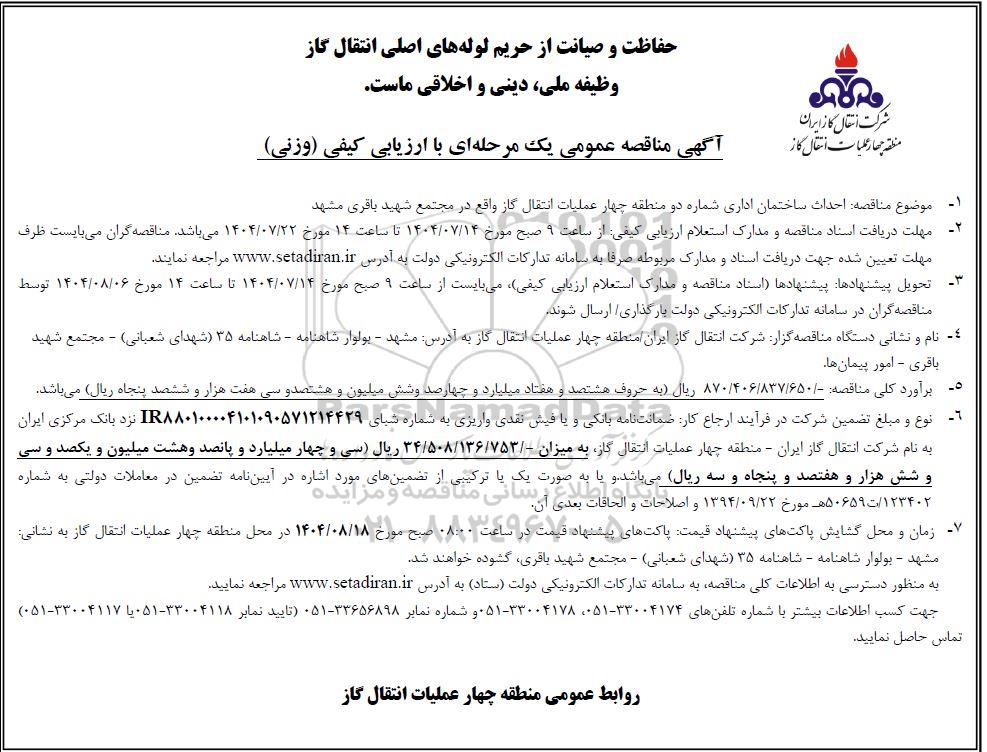 1. موضوع مناقصه: احداث ساختمان اداری شماره دو منطقه چهار عملیات انتقال گاز واقع در مجتمع شهید باقری مشهد