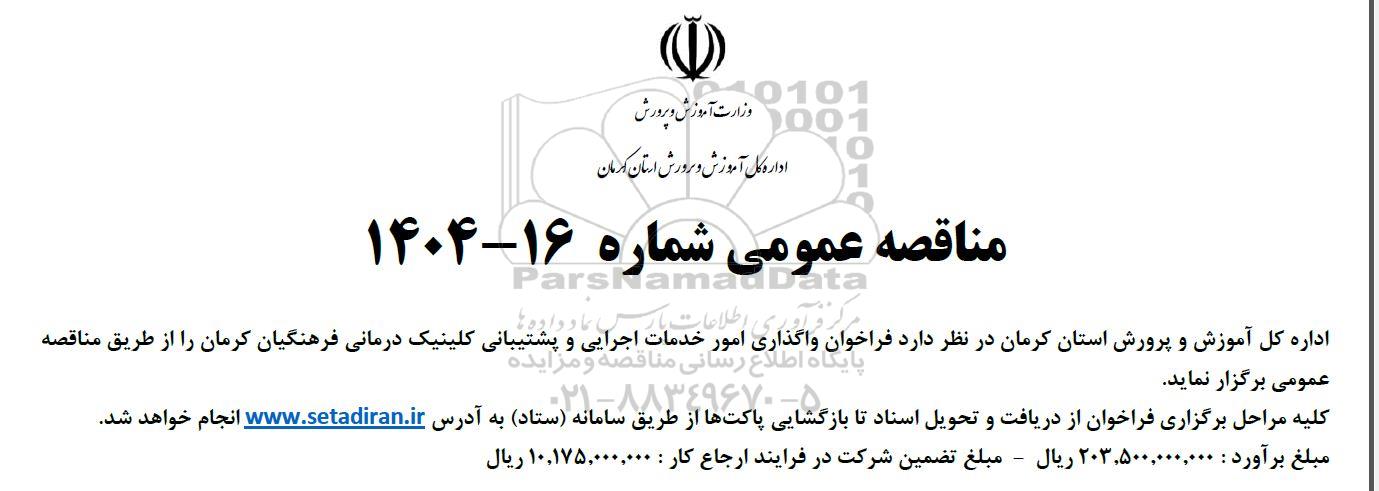 اداره کل آموزش و پرورش استان کرمان در نظر دارد فراخوان واگذاری امور خدمات اجرایی و پشتیبانی کلینیک درمانی فرهنگیان کرمان را از طریق مناقصه عمومی برگزار نماید.