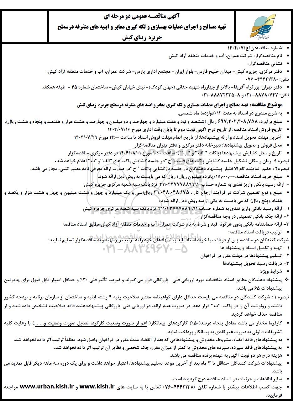 * نام مناقصه گذار: شرکت عمران، آب و خدمات منطقه آزاد کیش