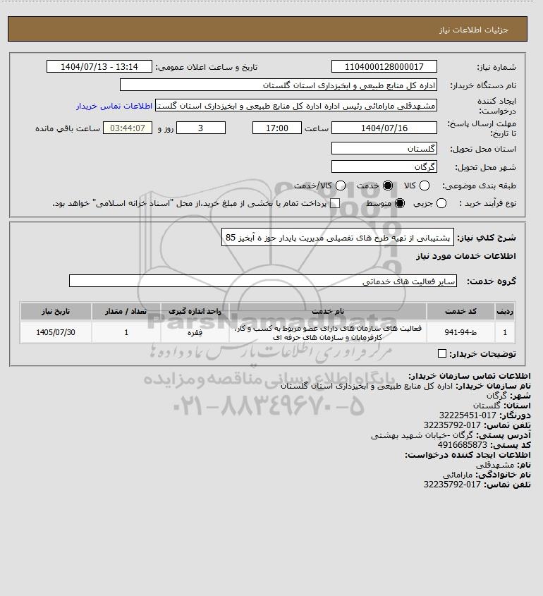 شرح کلی نیاز: پشتیبانی از تهیه طرح های تفصیلی مدیریت پایدار حوز ه آبخیز 85
