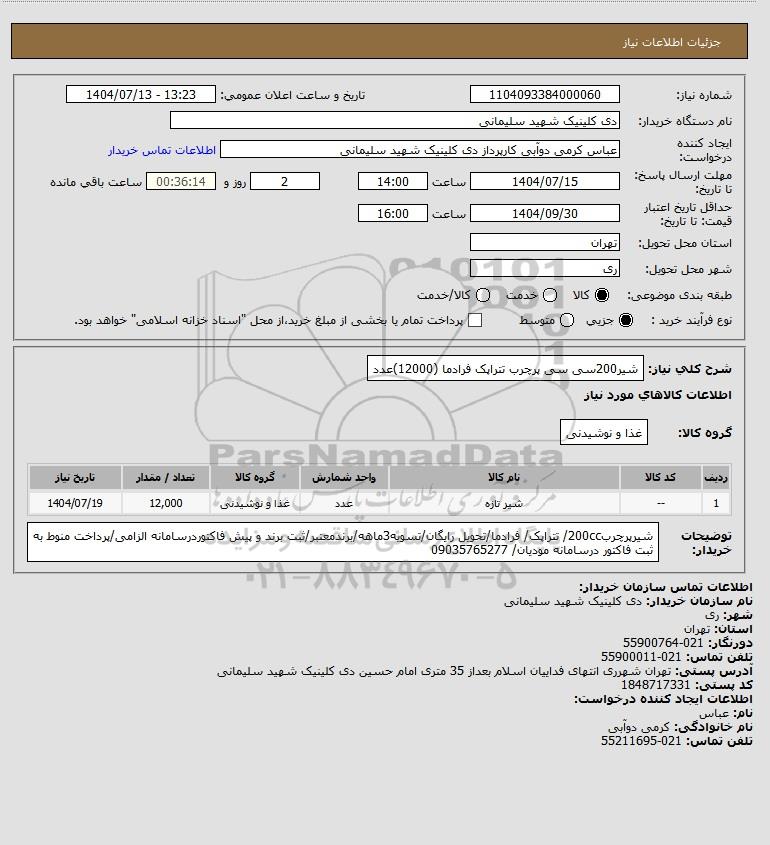 شرح کلی نیاز: شیر200سی سی پرچرب تتراپک فرادما (12000)عدد