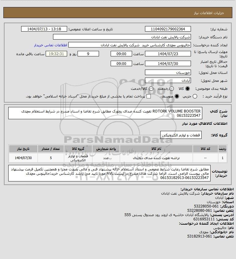 شرح کلی نیاز: ROTORK VOLUME BOOSTER تقویت کننده صدای روتورک مطابق شرح تقاضا و اسناد مندرج در شرایط استعلام محمدی 06153223547