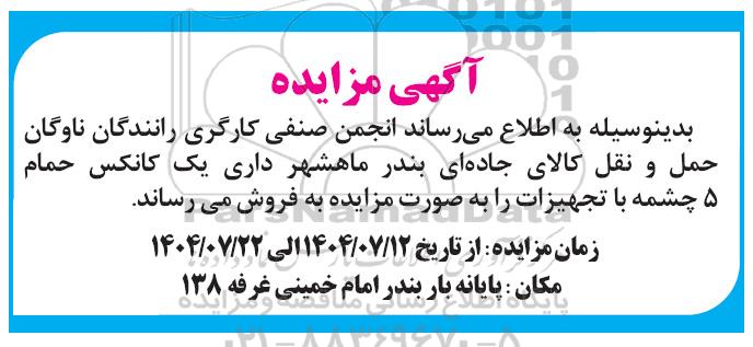 بدینوسیله به اطلاع میرساند انجمن صنفی کارگری رانندگان ناوگان حمل و نقل کالای جاده ای بندر ماهشهر داری یک کانکس حمام 5 چشمه با تجهیزات را به صورت مزایده به فروش می رساند.