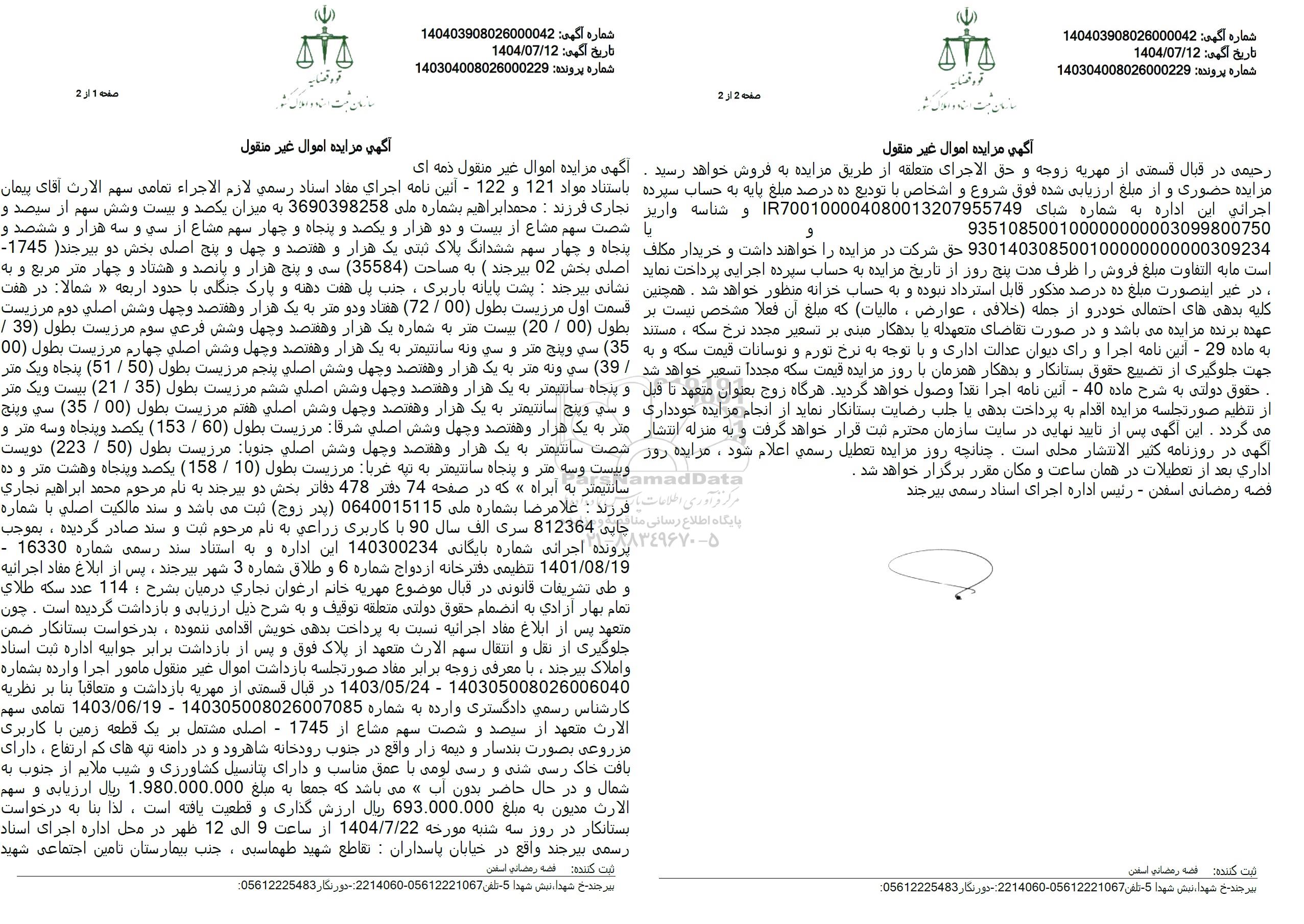 آگهی مزایده اموال غیر منقول دمه ای باستناد مواد 121 و 122 - آئین نامه اجرای مفاد استاد رسمی لازم الاجراء تمامى سهم الارث آقای پیمان تجاری فرزند محمد ابراهیم بشماره ملی 3690398258 به میزان یکصد و بیست و شش سهم از سیصد و یا شصت سهم مشاع از بیست و دو هزار و یکصد و پنجاه و چهار سهم مشاع از سی و سه هزار و ششصد و پنجاه و چهار سهم ششدانگ پلاک ثبتی یک هزار و هفتصد و چهل و پنج اصلی بخش دو بیرجند( 1745 اصلی بخش 02 بیرجند ) به مساحت (35584) سی و پنج هزار و پانصد و هشتاد و چهار متر مربع و به نشانی بیرجند : پشت پایانه باربری، جنب پل هفت دهنه و پارک جنگلی با حدود اربعه « شمالا در هفت قسمت اول مرزیست بطول (72/00) هفتاد و دو متر به یک هزار و هفتصد و چهل و شش اصلی دوم مرزیست بطول (00 / 20) بیست متر به شماره یک هزار و هفتصد و چهل و شش فرعی سوم مرزیست بطول (39/35) سی و پنج متر و سی و نه سانتیمتر به یک هزار و هفتصد و چهل و شش اصلی چهارم مرزیست بطول (39/00) سی و نه متر به یک هزار و هفتصد وجهل وشش اصلی پنجم مرزیست بطول 50 / 51) پنجاه و یک متر و پنجاه سانتیمتر به یک هزار و هفتصد و چهل و شش اصلی ششم مرزیست بطول (21/35) بیست و یک متر و سی وپنج سانتیمتر به یک هزار و هفتصد و چهل وشش اصلی هفتم مرزیست بطول 00 / 35) سی وینج متر به یک هزار و هفتصد و چهل و شش اصلی شرقا مرزیست بطول (60/153) یکصد و پنجاه و سه متر و شصت سانتیمتر به یک هزار و هفتصد وجهل وشش اصلی جنوبا مرریست بطول (50 / 223) دویست و بیست و سه متر و پنجاه سانتیمتر به تپه غربا مرزیست بطول (10/158) یکصد وپنجاه و هشت متر و ده سانتیمتر به آبراه » که در صفحه 74 دفتر 478 دفاتر بخش دو بیرجند به نام مرحوم محمد ابراهیم تجاری فرزند: غلامرضا بشماره ملی 0640015115 پدر زوج ثبت می باشد و سند مالکیت اصلی با شماره چاپی 812364 سری الف سال 90 با کاربری زراعی به نام مرحوم ثبت و سند صادر گردیده ، بموجب پرونده اجرانی شماره بایگانی 140300234 این اداره و به استناد سند رسمی شماره 16330 -1401/08/19 تنظیمی دفترخانه ازدواج شماره 6 و طلاق شماره 3 شهر بیرجند، پس از ابلاغ مفاد اجرائیه و طی تشریفات قانونی در قبال موضوع مهریه خانم ارغوان تجاری در میان بشرح : 114 عدد سکه طلای تمام بهار آزادی به انضمام حقوق دولتی متعلقه توقیف و به شرح ذیل ارزیابی و بازداشت گردیده است. چون متعهد پس از ابلاغ مفاد اجرائیه نسبت به پرداخت بدهی خویش اقدامی ننموده، بدرخواست بستانکار ضمن جلوگیری از نقل و انتقال سهم الارت متعهد از پلاک فوق و پس از بازداشت برابر جوابیه اداره ثبت اسناد و املاک بیرجند، با معرفی زوجه برابر مفاد صورتجلسه بازداشت اموال غیر منقول مامور اجرا وارده بشماره 140305008026006040 - 1403.05.24 در قبال قسمتی از مهریه بازداشت و متعاقبا بنا بر نظریه کارشناس رسمی دادگستری وارده به شماره 140305008026007085 - 1403.06.19 تمامی سهم الارت متعهد از سیصد و شصت سهم مشاع از 1745 - اصلی مشتمل بر یک قطعه زمین با کاربری مزروعی بصورت بندسار و دیمه زار واقع در جنوب رودخانه شاهرود و در دامنه تپه های کم ارتفاع، دارای یافت خاک رسی شنی و رسی لومی با عمق مناسب و دارای پتانسیل کشاورزی و شیب ملایم از جنوب به شمال و در حال حاضر بدون آب » می باشد که جمعا به مبلغ 1.980.000.000 ریال ارزیابی و سهم الارت مدیون به مبلغ 693.000.000 ریال ارزش گذاری و قطعیت یافته است، لذا بنا به درخواست بستانکار در روز سه شنبه مورخه 1404.7.22 از ساعت 9 الی 12 ظهر در محل اداره اجرای اسناد رسمی بیرجند واقع در خیابان پاسداران : تقاطع شهید طهماسبی، جنب بیمارستان تامین اجتماعی شهید رحیمی در قبال قسمتی از مهریه زوجه و حق الاجرای متعلقه از طریق مزایده به فروش خواهد رسید. مرایده حضوری و از مبلغ ارزیابی شده فوق شروع و اشخاص با تودیع ده درصد مبلغ پایه به حساب سپرده و شناسه واریزIR700100004080013207955749 و شناسه وایز