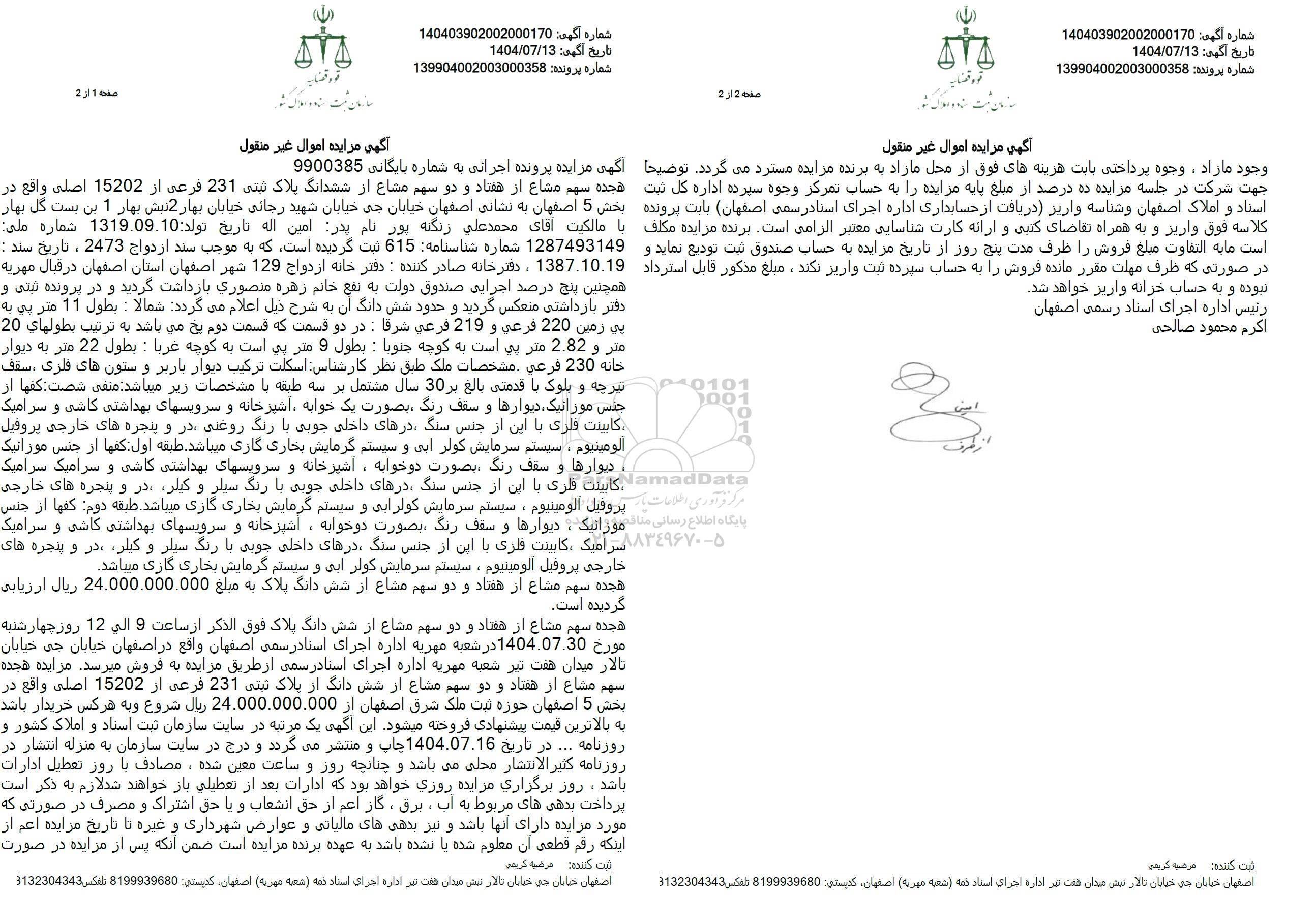 هجده سهم مشاع از هفتاد و دو سهم مشاع از شش دانگ پلاک فوق الذكر ارساعت 9 الی 12 روز چهارشنبه مورخ 1404.07.30 در شعبه مهریه اداره اجرای اسنادرسمی اصفهان واقع در اصفهان خیابان جی خیابان تالار میدان هفت تیز شعبه مهریه اداره اجرای اسنادرسمی از طریق مزایده به فروش میرسد. مزایده هجده سهم مشاع از هفتاد و دو سهم مشاع از شش دانگ از پلاک ثبتی 231 فرعی از 15202 اصلی واقع در بخش 5 اصفهان حوزه ثبت ملک شرق اصفهان از 24.000.000.000 ریال شروع و به هرکس خریدار باشد. به بالاترین قیمت پیشنهادی فروخته میشود. این آگهی یک مرتبه در سایت سازمان ثبت اسناد و املاک کشور و روزنامه ... در تاریخ 1404.07.16 چاپ و منتشر می گردد و درج در سایت سازمان به منزله انتشار در روزنامه کثیر الانتشار محلی می باشد و چنانچه روز و ساعت معین شده، مصادف با روز تعطیل ادارات باشد، روز برگزاری مزایده روزی خواهد بود که ادارات بعد از تعطیلی باز خواهند شد لازم به ذکر است. پرداخت بدهی های مربوط به آب ، برق ، گاز اعم از حق انشعاب و با حق اشتراک و مصرف در صورتی که مورد مزایده دارای آنها باشد و نیز بدهی های مالیاتی و عوارض شهرداری و غیره تا تاریخ مزایده اعم از اینکه رقم قطعی آن معلوم شده یا نشده باشد به عهده برنده مزایده است ضمن آنکه پس از مزایده در صورت وجود مازاد، وجوه پرداختی بابت هزینه های فوق از محل مازاد به برنده مزایده مسترد می گردد. توضیحا جهت شرکت در جلسه مزایده ده درصد از مبلغ پایه مزایده را به حساب تمرکز وجوه سپرده اداره کل ثبت اسناد و املاک اصفهان و شناسه واریز دریافت از حسابداری اداره اجرای اسنادرسمی (اصفهان) بابت پرونده کلاسه فوق واریز و به همراه تقاضای کتبی و ارائه کارت شناسایی معتبر الزامی است. برنده مزایده مکلف است ما به التفاوت مبلغ فروش را ظرف مدت پنج روز از تاریخ مزایده به حساب صندوق ثبت تودیع نماید و در صورتی که ظرف مهلت مقرر مانده فروش را به حساب سپرده ثبت واریز نکند، مبلغ مذکور قابل استرداد نبوده و به حساب خزانه واریز خواهد شد.