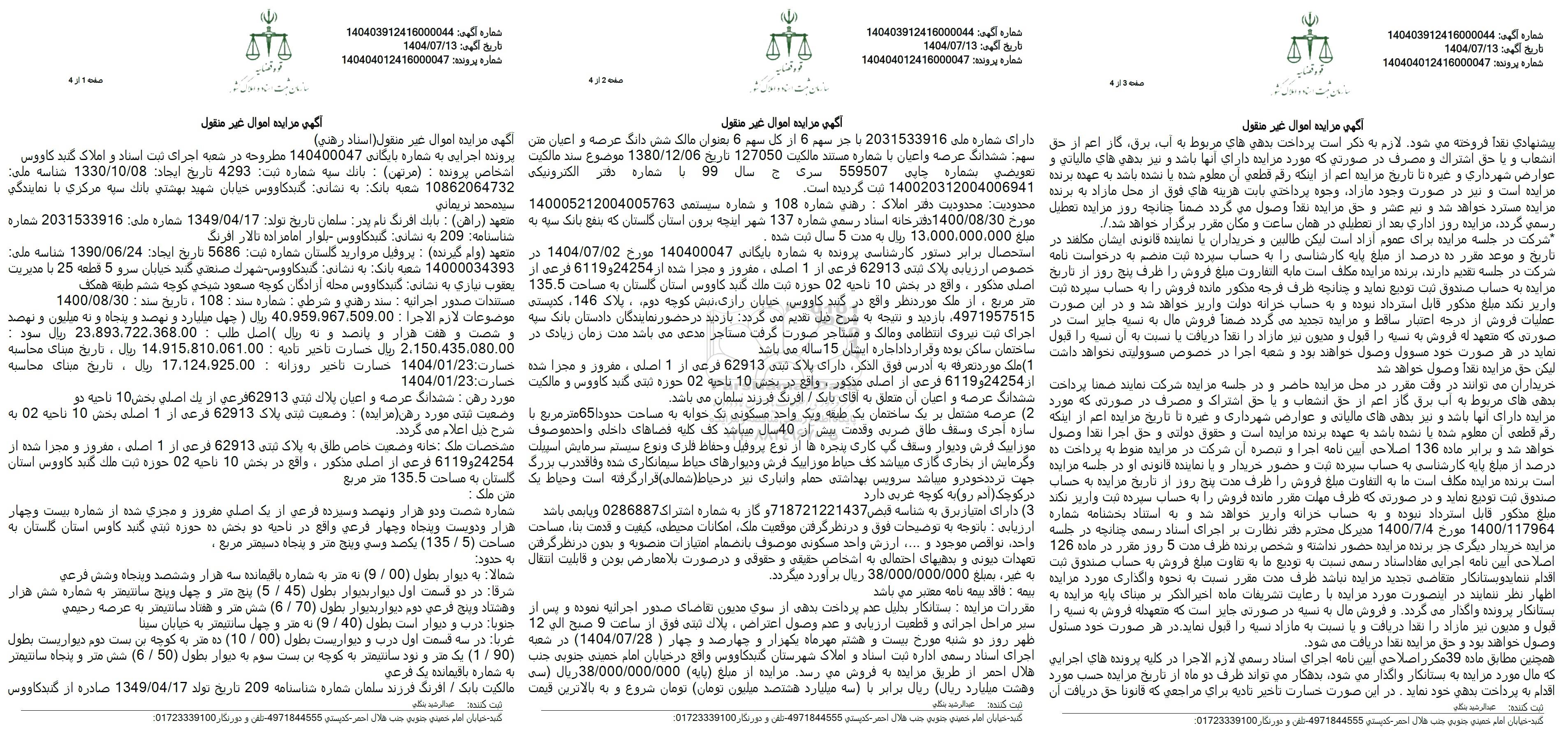 مزایده فروش ششدانگ عرصه و اعیان به پلاک ثبتی 62913 فرعی از یک اصلی به مساحت 135.5 مترمربع واقع در گنبد کاووس گلستان