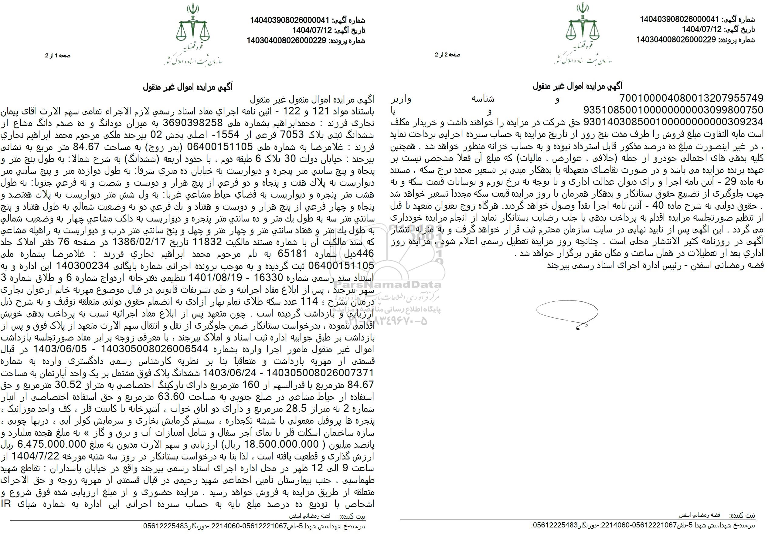 آگهی مزایده اموال منقول غیر منقول باستناد مواد 121 و 122 - آئین نامه اجرای مفاد اسناد رسمی لازم الاجراء تمامی سهم الارث آقای پیمان تجاری فرزند: محمد ابراهیم بشماره ملی 3690398258 به میزان دودانگ و ده صدم دانگ مشاع از ششدانگ ثبتی پلاک 7053 فرعی از 1554 اصلی بخش 02 بیرجند ملکی مرحوم محمد ابراهیم نجاری فرزند : غلامرضا به شماره ملی 06400151105 پدر زوج به مساحت 84.67 متر مربع به نشانی بیرجند : خیابان دولت 30 پلاک 6 طبقه دوم، با حدود اربعه (ششدانگ) به شرح شمالا به طول پنج متر و پنجاه و پنج سانتی متر پنجره و دیواریست به خیابان ده متری شرقا به طول دوازده متر و پنج سانتی متر دیواریست به پلاک هفت و پنجاه و دو فرعی از پنج هزار و دویست و شصت و نه فرعی جنوبا به طول هشت متر پنجره و دیواریست به فضای حیاط مشاعی غربا به ول شش متر دیواریست به پلاک هفتصد و پنجاه و چهار فرعی از پنج هزار و دویست و هفتاد و یك فرعی دو به وضعیت شمالی به طول هفتاد و پنج سانتی متر سه به طول یك متر و ده سانتی متر پنجره و دیواریست به داکت مشاعی چهار به وضعیت شمالی به طول یک متر و هفتاد سانتی متر و چهار متر و چهل و پنج سانتی متر درب و دیواریست به راهیله مشاعی که سند مالکیت آن با شماره مستند مالکیت 11832 تاریخ 1386/02/17 در صفحه 76 دفتر املاک جلد 446 ذیل شماره 65181 به نام مرحوم محمد ابراهیم تجاری فرزند : غلامرضا بشماره ملی 06400151105 ثبت گردیده و به موجب پرونده اجرانی شماره بایگانی 140300234 این اداره و به استناد سند رسمی شماره 16330 - 1401.08.19 تنظیمی دفترخانه ازدواج شماره 6 و طلاق شماره 3 شهر بیرجند، پس از ابلاغ مفاد اجرائیه و طی تشریفات قانونی در قبال موضوع مهریه خانم ارغوان تجاری درمیان بشرح : 114 عدد سکه طلای تمام بهار آزادی به انضمام حقوق دولتی متعلقه توقیف و به شرح ذیل ارزیابی و بازداشت گردیده است. چون متعهد پس از ابلاغ مفاد اجرائیه نسبت به پرداخت بدهی خویش اقدامی ننموده ، پدرخواست بستانکار ضمن جلوگیری از نقل و انتقال سهم الارث متعهد از پلاک فوق و پس از بازداشت بر طبق جوابیه اداره ثبت اسناد و املاک بیرجند ، با معرفی زوجه برابر مفاد صورتجلسه بازداشت اموال غیر منقول مامور اجرا وارده بشماره 140305008026006544 - 1403.06.05 در قبال قسمتی از مهریه بازداشت و متعاقباً بنا بر نظریه کارشناس رسمی دادگستری وارده به شماره 140305008026007371 - 1403.06.24 ششدانگ پلاک فوق مشتمل بر یک واحد آپارتمان به مساحت 84.67 متر مربع با قدر السهم از 160 متر مربع دارای پارکینگ اختصاصی به متر از 30.52 متر مربع و حق استفاده از حیاط مشاعی در ضلع جنوبی به مساحت 63.60 متر مربع و حق استفاده اختصاصی از انبار شماره 2 به متراز 28.5 متر مربع و دارای دو اتاق خواب اشپرخانه با کابینت فلر ، کف واحد موراتیک . پنجره ها پروفیل معمولی با شیشه تکجداره ، سیستم گرمایش بخاری و سرمایش کولر آبی ، دربها چوبی . سازه ساختمان اسکلت فلر با نمای آجر سفال و شامل امتیازات آب و برق و گاز » به مبلغ هجده میلیارد و پانصد میلیون ) 18.500.000.000 ریال ارزیابی و سهم الارث مدیون به مبلغ 6.475.000.000 ریال ارزش گذاری و قطعیت یافته است. لذا بنا به درخواست بستانکار در روز سه شنبه مورخه 1404.7.22 از ساعت 9 الى 12 ظهر در محل اداره اجرای اسناد رسمی بیرجند واقع در خیابان پاسداران : تقاطع شهید طهماسبی ، جنب بیمارستان تامین اجتماعی شهید رحیمی در قبال قسمتی از مهریه زوجه و حق الاجرای متعلقه از طریق مزایده به فروش خواهد رسید. مزایده حضوری و از مبلغ ارزیابی شده فوق شروع و اشخاص با تودیع ده درصد مبلغ پایه به حساب سپرده اجرائی این اداره به شماره شبای IR