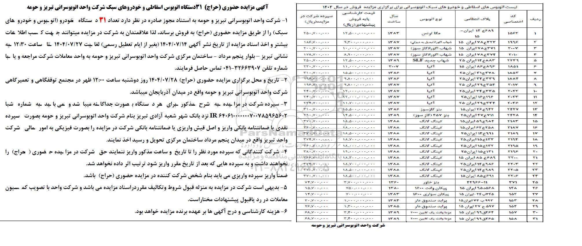 آگهی مزایده حضوری (حراج) 31 دستگاه اتوبوس اسقاطی و خودروهای سبک شرکت واحد اتوبوسرانی تبریز و حومه