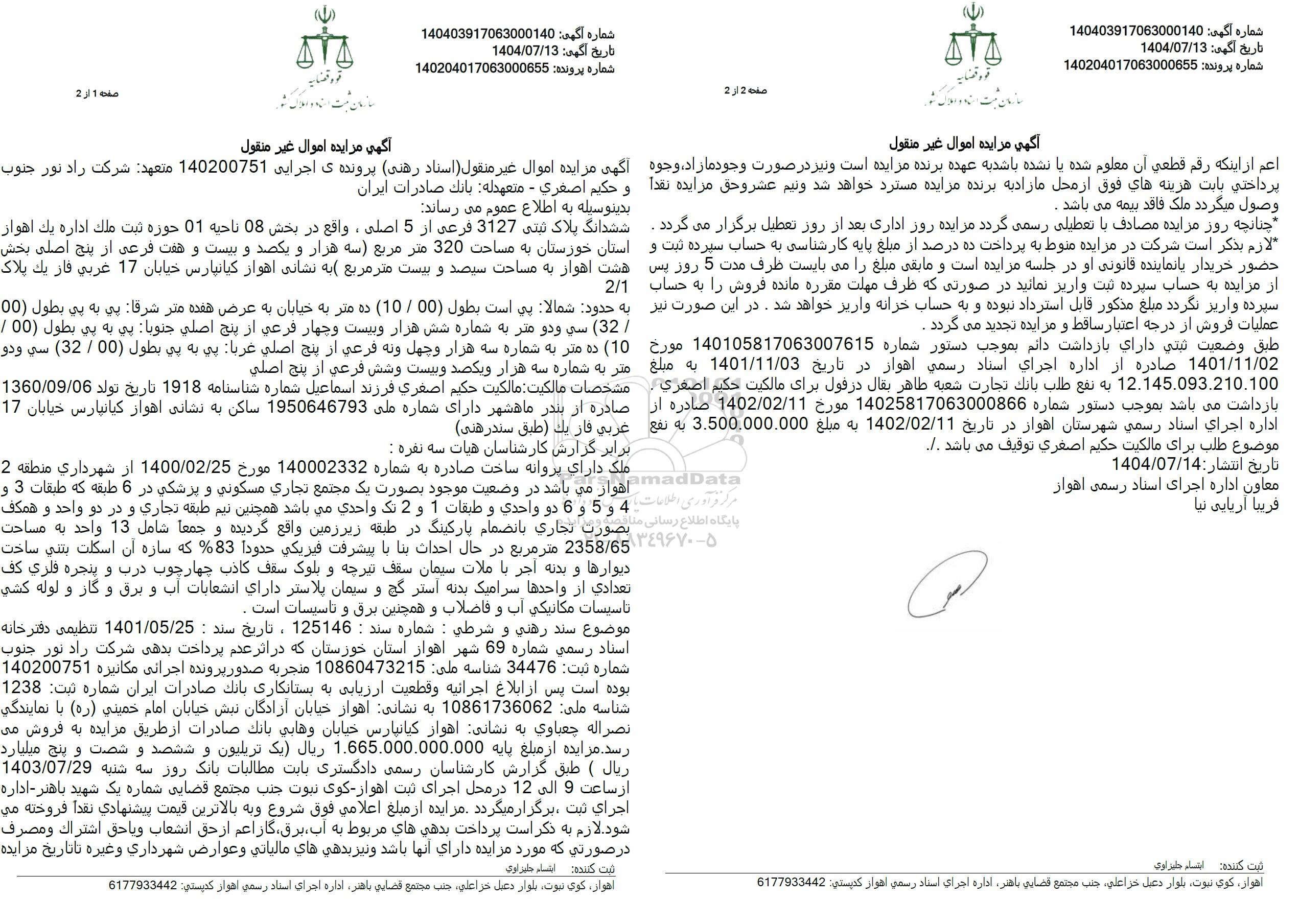 مزایده از مبلغ پایه 1.665.000.000.000 ریال یک تریلیون و ششصد و شصت و پنج میلیارد ریال ) طبق گزارش کارشناسان رسمی دادگستری بابت مطالبات بانک روز سه شنبه 1403.07.29 ارساعت 9 الى 12 در محل اجرای ثبت اهواز - کوی نبوت جنب مجتمع قضایی شماره یک شهید باهنر - اداره اجرای ثبت برگزار میگردد.