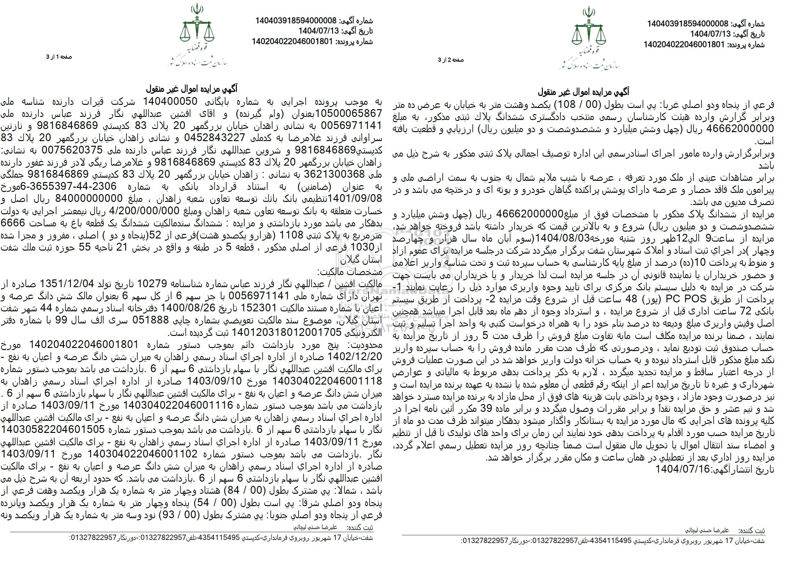 مزایده ششدانگ یک قطعه باغ به مساحت 6666 متر مربع , مزایده ششدانگ یک قطعه باغ به مساحت 6666 متر مربع