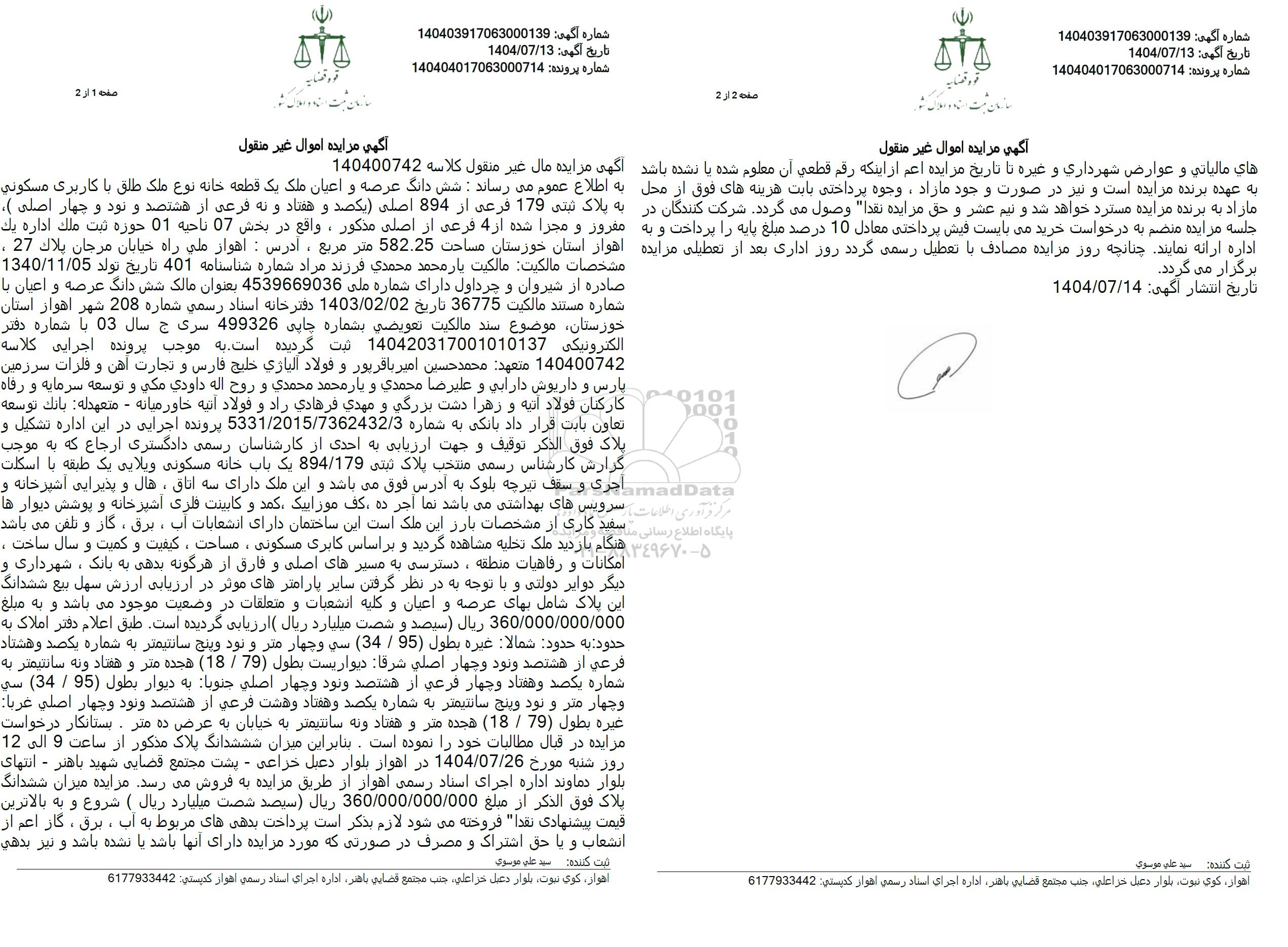 اگهی مزایده مال غیر منقول كلاسه 140400742 به اطلاع عموم می رساند : شش دانگ عرصه و اعیان ملک یک قطعه خانه نوع ملک طلق با کاربری مسکونی به پلاک ثبتی 179 فرعی از 894 اصلی یکصد و هفتاد و نه فرعی از هشتصد و نود و چهار اصلی مغرور و مجرا شده از 4 فرعی از اصلی مذکور، واقع در بخش 07 ناحیه 01 حوزه ثبت ملک اداره يك اهواز استان خوزستان مساحت 582.25 متر مربع، آدرس: اهواز ملی راه خیابان مرجان يلاك 27 . مشخصات مالکیت مالکيت يار محمد محمدي فرزند مراد شماره شناسنامه 401 تاریخ تولد 1340.11.05 صادره از شیروان و چرداول دارای شماره ملی 4539669036 بعنوان مالک شش دانگ عرصه و اعیان با شماره مستند مالکیت 36775 تاريخ 1403.02.02 دفترخانه اسناد رسمی شماره 208 شهر اهواز استان خورستان موضوع سند مالكيت تعويضي بشماره چاپی 499326 سری ج سال 03 با شماره دفتر الکترونیکی 140420317001010137 ثبت گردیده است. به موجب پرونده اجرایی کلاسه 140400742 متعهد: محمد حسین امیر باقرپور و فولاد البازي خلیج فارس و تجارت آهن و فلزات سرزمین پارس و داریوش دارایی و علیرضا محمدی و بار محمد محمدی و روح اله داودي مكي و توسعه سرمایه و رفاه کارکنان فولاد آتیه و زهرا دشت بزرگی و مهدی فرهادی راد و فولاد اتيه خاورمیانه - متعهدله بانك توسعه تعاون بابت قرار داد بانکی به شماره 5331.2015.7362432.3 پرونده اجرایی در این اداره تشکیل و پلاک فوق الذکر توقیف و جهت ارزیابی به احدی از کارشناسان رسمی دادگستری ارجاع که به موجب گزارش کارشناس رسمی منتخب پلاک ثبتی 894.179 یک باب خانه مسکونی ویلایی یک طبقه با اسکات آجری و سقف تیرچه بلوک به آدرس فوق می باشد و این ملک دارای سه اتاق ، هال و پذیرایی آشپزخانه و سرویس های بهداشتی می باشد نما آجر ده کف موزاییک کمد و کابینت فلری اشپرخانه و پوشش دیوارها سفید کاری از مشخصات بارز این ملک است این ساختمان دارای انشعابات آب ، برق ، گار و تلفن می باشد. هنگام باردید ملک تخلیه مشاهده گردید و بر اساس کابری مسکونی، مساحت، کیفیت و کمیت و سال ساخت . امکانات و رفاهیات منطقه، دسترسی به مسیرهای اصلی و فارق از هرگونه بدهی به بانک ، شهرداری و دیگر دوایر دولتی و با توجه به در نظر گرفتن سایر پارامترهای موثر در ارزیابی ارزش سهل بیع ششدانگ این پلاک شامل بهای عرصه و اعیان و کلیه انشعبات و متعلقات در وضعیت موجود می باشد و به مبلغ 360.000.000.000 ريال ( سيصد و شصت میلیارد ریال ) ارزیابی گردیده است. طبق اعلام دفتر املاک به حدود به حدود شمالا : غيره بطول (95) . (34) سي و چهار متر و نود وپنج سانتیمتر به شماره یکصد و هشتاد فرعی از هشتصد و نود و چهار اصلي شرقا ديواريست بطول 79 . 18) هجده متر و هفتاد و به سانتیمتر به شماره یکصد و هفتاد و چهار فرعی از هشتصد و نود و چهار اصلی جنوبا به دیوار بطول (95 . 34) سي و چهار متر و نود و پنج سانتیمتر به شماره یکصد و هفتاد و هشت فرعی از هشتصد و نود و چهار اصلي غربا غيره بطول (79) . (18) هجده متر و هفتاد و نه سانتیمتر به خیابان به عرض ده متر بستانکار درخواست مزایده در قبال مطالبات خود را نموده است. بنابراین میزان شششدانگ پلاک مذکور از ساعت 9 الی 12 روز شنبه مورخ 1404.07.26 در اهواز بلوار دعبل خزاعی - پشت مجتمع قضایی شهید باهنر - انتهای بلوار دماوند اداره اجرای اسناد رسمی اهواز از طریق مزایده به فروش میرسد. مزایده میزان ششدانگ بلاک فوق الذکر از مبلغ 360.000.000.000 ريال (سیصد شصت میلیارد ریال ) شروع و به بالاترین قیمت پیشنهادی نقدا فروخته میشود لازم بذکر است پرداخت بدهی های مربوط به آب ، برق ، گار اعم از انشعاب و یا حق اشتراک و مصرف در صورتی که مورد مزایده دارای آنها باشد با نشده باشد و نیز بدهی های مالیاتی و عوارض شهرداری و غیره تا تاریخ مزایده اعم از اینکه رقم قطعی آن معلوم شده یا نشده باشد به عهده برنده مزایده است و نیز در صورت وجود مازاد ، وجوه پرداختی بابت هزینه های فوق از محل مازاد به برنده مزایده مسترد خواهد شد و نیم عشر و حق مزایده نقدا وصول میگردد. شرکت کنندگان در جلسه مزایده منضم به درخواست خرید می بایست فیش پرداختی معادل 10 در